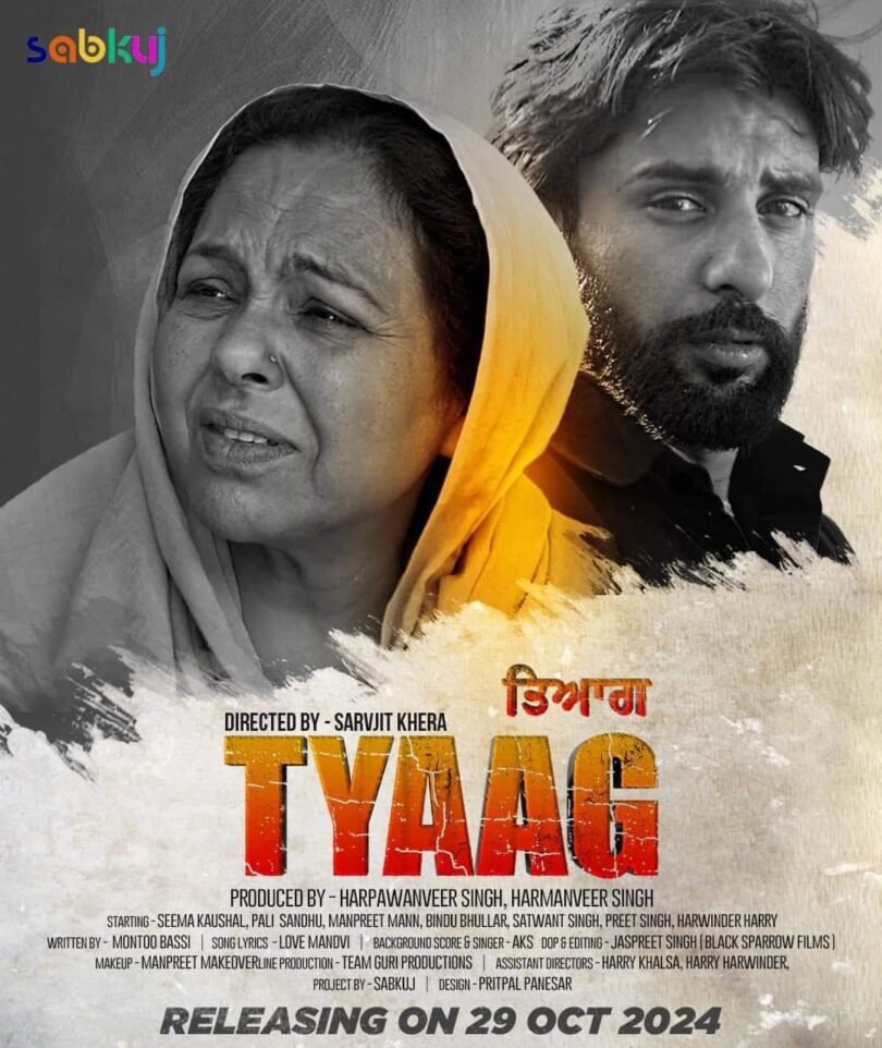 (16 ਅਕਤੂਬਰ, ਪੰ.ਸ. ਵਿਸ਼ੇਸ:)ਪੰਜਾਬੀ ਸਿਨੇਮਾ, ਲਘੂ ਫ਼ਿਲਮਜ਼ ਅਤੇ ਵੈੱਬ ਸੀਰੀਜ਼ ਦੇ ਖੇਤਰ ਵਿੱਚ ਕਈ ਨਿਰਮਾਤਾ ਅਤੇ ਨਿਰਦੇਸ਼ਕ ਇਨ੍ਹੀਂ ਦਿਨੀਂ ਅਲਹਦਾ ਕੋਸ਼ਿਸਾਂ ਨੂੰ ਅੰਜ਼ਾਮ ਦੇਣ ਵਿਚ ਮੋਹਰੀ ਭੂਮਿਕਾ ਨਿਭਾ ਰਹੇ ਹਨ ਅਤੇ ਕੀਤੇ ਜਾ ਰਹੇ ਇੰਨ੍ਹਾਂ ਹੀ ਸਾਰਥਿਕ ਯਤਨਾਂ ਦੀ ਲੜੀ ਵਜੋਂ ਸਾਹਮਣੇ ਆਉਣ ਜਾ ਰਹੀ ਪੰਜਾਬੀ ਲਘੂ ਫ਼ਿਲਮ ‘ਤਿਆਗ’, ਜੋ ਜਲਦ ਹੀ ਸੋਸ਼ਲ ਪਲੇਟਫ਼ਾਰਮ ‘ਸਬਕੁਜ’ ਉੱਪਰ ਰਿਲੀਜ਼ ਹੋਣ ਜਾ ਰਹੀ ਹੈ । ‘ਸਬਕੁਜ’ ਫ਼ਿਲਮਜ਼ ਅਤੇ ਪ੍ਰੋਡਕਸ਼ਨ ਕੈਨੇਡਾ ਦੇ ਬੈਨਰ ਹੇਠ ਬਣਾਈ ਅਤੇ ਪ੍ਰਸਤੁਤ ਕੀਤੀ ਜਾ ਰਹੀ ਇਸ ਅਰਥ-ਭਰਪੂਰ ਫ਼ਿਲਮ ਦਾ ਨਿਰਮਾਣ ਹਰਪਵਨਵੀਰ ਸਿੰਘ ਅਤੇ ਹਰਮਨਵੀਰ ਸਿੰਘ ,ਜਦਕਿ ਨਿਰਦੇਸ਼ਨ ਸਰਵਜੀਤ ਖੇੜਾ ਦੁਆਰਾ ਕੀਤਾ ਗਿਆ ਹੈ, ਜੋ ਇਸ ਤੋਂ ਪਹਿਲਾਂ ਵੀ ਪੀ.ਟੀ.ਸੀ. ‘ਤੇ ਕਈ ਬਾਕਸ-ਆਫਿਸ ਲਈ ਕਈ ਬੇਹਤਰੀਣ ਫ਼ਿਲਮਾਂ ਦਾ ਨਿਰਦੇਸ਼ਨ ਕਰ ਚੁੱਕੇ ਹਨ । ਮੇਨ ਸਟ੍ਰੀਮ ਫ਼ਿਲਮਾਂ ਤੋਂ ਬਿਲਕੁਲ ਹੱਟ ਕੇ ਬਣਾਈ ਗਈ ਇਸ ਭਾਵਨਾਤਮਕ ਫ਼ਿਲਮ ਦੇ ਥੀਮ ਸਬੰਧੀ ਜਾਣਕਾਰੀ ਸਾਂਝਾ ਕਰਦਿਆਂ ਨਿਰਮਾਣ ਟੀਮ ਨੇ ਦੱਸਿਆ ਕਿ ਮਾਂ ਅਤੇ ਪੁੱਤ ਦੇ ਪਿਆਰ ਅਤੇ ਬਲਿਦਾਨ ਦੀ ਗੱਲ ਕਰਦੀ ਇਸ ਫ਼ਿਲਮ ਵਿਚ ਪੰਜਾਬੀ ਸਿਨੇਮਾਂ ਦੀ ਮੰਝੀ ਹੋਈ ਅਦਾਕਾਰਾ ਸੀਮਾ ਕੌਸ਼ਲ ਵੱਲੋਂ ਲੀਡ ਭੂਮਿਕਾ ਨਿਭਾਈ ਗਈ ਹੈ, ਜਿੰਨ੍ਹਾਂ ਤੋਂ ਇਲਾਵਾ ਪਾਲੀ ਸੰਧੂ, ਮਨਪ੍ਰੀਤ ਮਾਨ, ਬਿੰਦੂ ਭੁੱਲਰ, ਸਤਵੰਤ ਸਿੰਘ, ਪ੍ਰੀਤ ਸਿੰਘ, ਹਰਵਿੰਦਰ ਹੈਰੀ ਵੀ ਮਹੱਤਵਪੂਰਨ ਕਿਰਦਾਰਾਂ ਵਿਚ ਨਜ਼ਰ ਆਉਣਗੇ । ਸਮਾਜਿਕ ਸਰੋਕਾਰਾਂ ਨਾਲ ਜੁੜੀ ਅਤੇ ਮਾਂ ਦੀਆਂ ਆਪਣੇ ਪੁੱਤ ਪ੍ਰਤੀ ਹਮੇਸ਼ਾ ਰਹਿਣ ਵਾਲੀਆਂ ਕੋਮਲ ਭਾਵਨਾਵਾਂ ਦੀ ਤਰਜ਼ਮਾਨੀ ਕਰਦੀ ਇਹ ਫ਼ਿਲਮ ਦਿਲ ਨੂੰ ਛੂਹ ਲੈਣ ਵਾਲੀ ਕਹਾਣੀ ਦੇ ਤਾਣੇ -ਬਾਣੇ ਅਧੀਨ ਬੁਣੀ ਗਈ ਹੈ, ਜਿਸ ਵਿਚ ਇਹ ਵੀ ਦਰਸਾਇਆ ਗਿਆ ਹੈ ਕਿ ਪੁੱਤ ਨਾਲਾਇਕੀ ਜਾਂ ਫਿਰ ਕੋਈ ਗਲਤੀ ਵੀ ਕਰ ਜਾਵੇ ਤਾਂ ਮਾਂ ਉਸ ਦੇ ਔਗੁਣਾਂ ਅਤੇ ਹੋਈਆਂ ਭੁੱਲਾਂ ਨੂੰ ਆਪਣੇ ਸਿਰ ਲੈਣੋ ਅਤੇ ਆਪਾ ਤੱਕ ਵਾਰ ਜਾਣ ਤੋਂ ਵੀ ਪਿੱਛੇ ਨਹੀ ਹੱਟਦੀ । ਪੰਜਾਬ ਦੇ ਮੁਹਾਲੀ-ਖਰੜ ਆਸਪਾਸ ਫ਼ਿਲਮਾਈ ਗਈ ਇਹ ਫ਼ਿਲਮ 29 ਅਕਤੂਬਰ ਨੂੰ ‘ਸਬਕੁਜ’ ਸੋਸ਼ਲ ਪਲੇਟਫ਼ਾਰਮ ਉੱਪਰ ਸਟਰੀਮ ਹੋਣ ਜਾ ਰਹੀ ਹੈ, ਜਿਸ ਦਾ ਟ੍ਰੇਲਰ ਵੀ ਜਲਦ ਜਾਰੀ ਹੋਣ ਜਾ ਰਿਹਾ ਹੈ ।