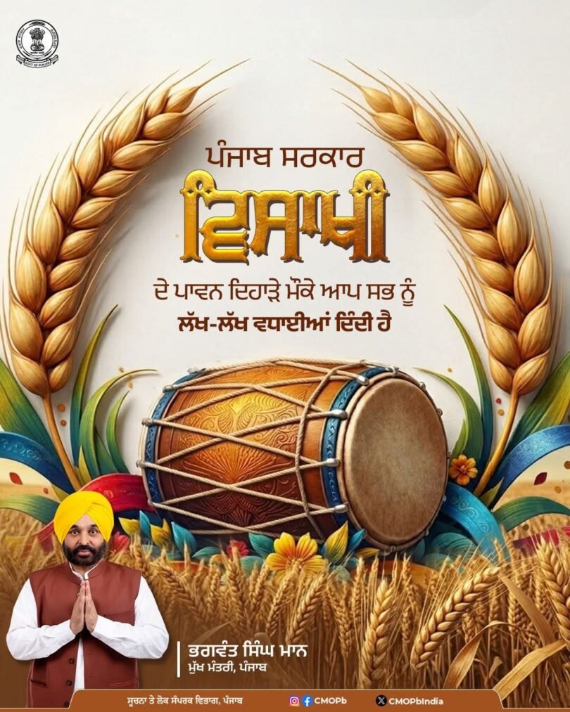ਮੁੱਖ ਮੰਤਰੀ ਭਗਵੰਤ ਸਿੰਘ ਮਾਨ ਦੀ ਅਗਵਾਈ ਵਾਲੀ ਪੰਜਾਬ ਸਰਕਾਰ ਵਿਸਾਖੀ ਦੇ ਪਾਵਨ ਦਿਹਾੜੇ ਮੌਕੇ ਆਪ ਸਭ ਨੂੰ ਲੱਖ-ਲੱਖ ਵਧਾਈਆਂ ਦਿੰਦੀ ਹੈ।